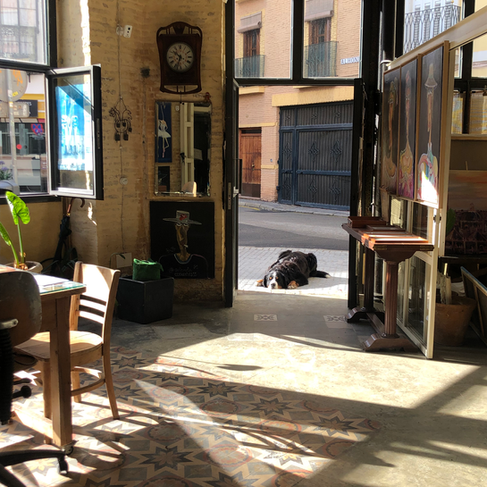 El estudio de Antonelo Collantes habita el número uno de la Plaza San Leandro. Desde lejos se anuncia. Hay algo en él que llama, que invita a detenerse. Solo cuando te acercas a sus grandes ventanas abiertas entiendes por qué: los cuadros se asoman, respiran hacia la calle, dialogan con quienes pasan. No es una exageración decirlo: es uno de los estudios más bonitos que he encontrado en Sevilla.