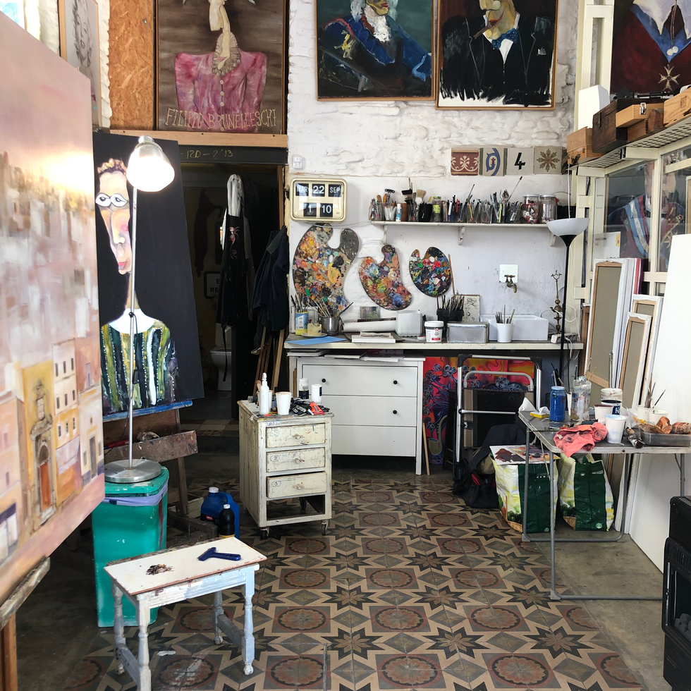 Dentro, un reloj antiguo marca las horas, pero avanza con una lógica propia. A pesar del frío, la luz de esta mañana es amarilla. Entra sin pedir permiso por las ventanas y se posa sobre los lienzos, sobre las paredes altísimas, sobre los pinceles usados. Todo queda envuelto en una calma que no pide atención.